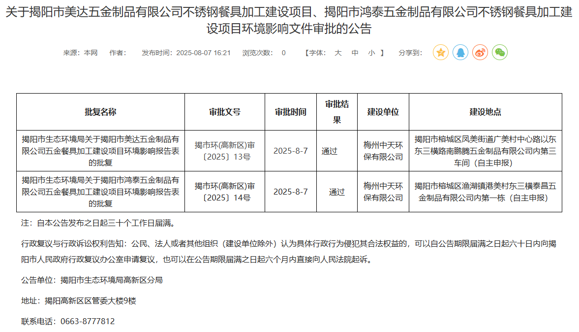 2025年8月7日,揭陽市生態(tài)環(huán)境局高新區(qū)分局就2個不銹鋼餐具加工建設項目環(huán)境影響報告表作出審批通過并對外進行公告,公告期:自本公告發(fā)布之日起三十個工作日屆滿。