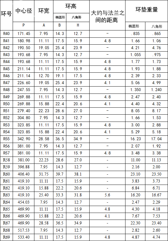 R型墊片的制造符合API 6A、6B和ASME b16.20適合API ASME/ANSI B16.5法蘭。在橢圓形和八角形配置,這兩種類型是可互換的現(xiàn)代八角型槽法蘭。
